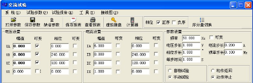 将保护出口跳闸接点接入测试仪的开入量1,设置IA=6A,IB=IC=0,UA=UB=UC=0V,相位为0,120,240度(实际为负序)。选择UA、UB和UC同时可变,用【手动试验】方式同时